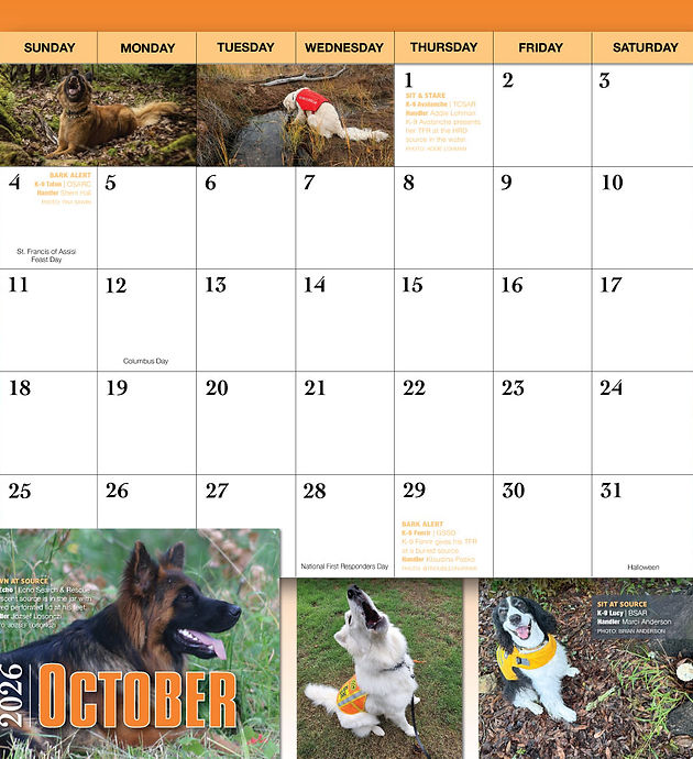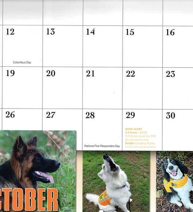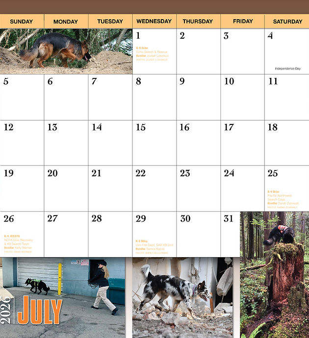 Es ist uns eine große Ehre, dass die ECHO Such- und Rettungshunde Faith und Echo im amerikanischen Suchhund-Kalender 2026 aufgenommen wurden. Wir sind stolz auf sie und unsere gemeinsame Arbeit. Vielen Dank für die Gelegenheit!